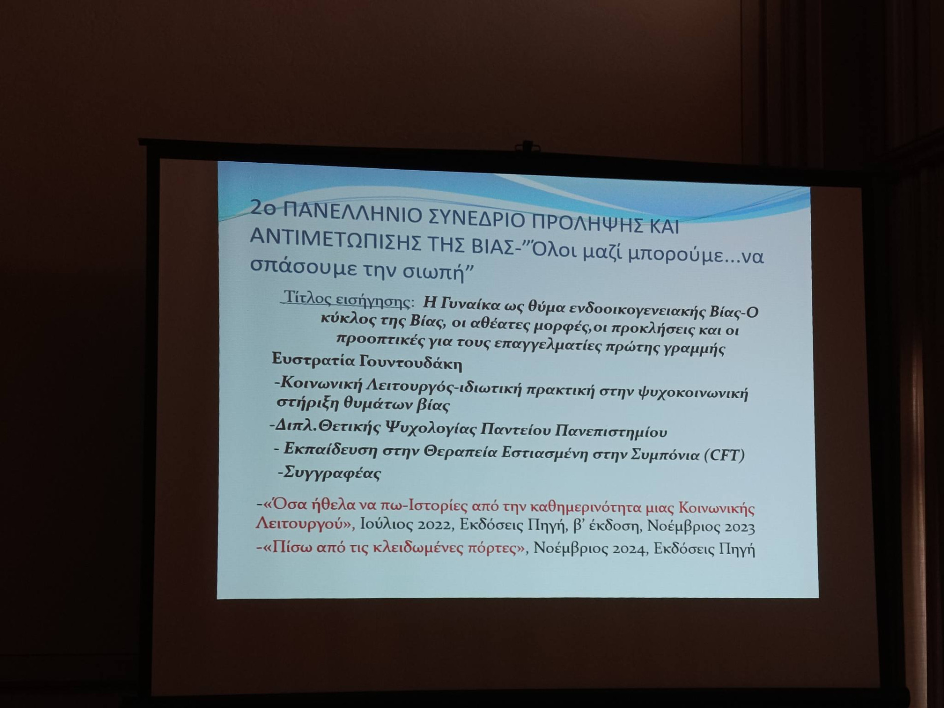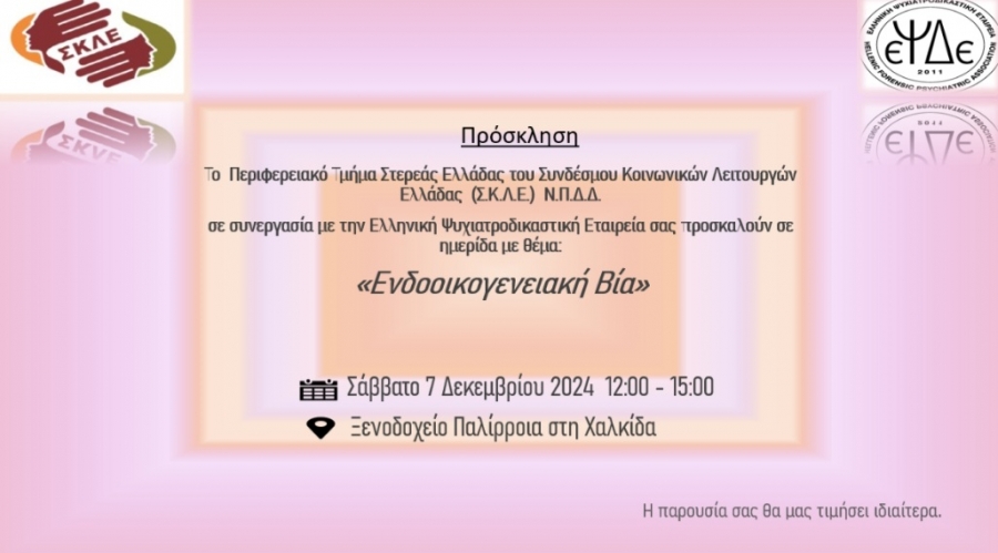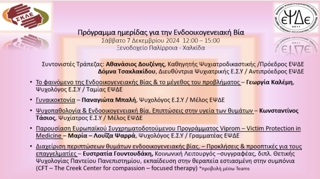 Από την διαδικτυακή συμμετοχή στην ημερίδα με τίτλο "Ενδοοικογενειακή Βία", διοργανωθείσα από το Περιφερειακό Τμήμα Στερεάς Ελλάδας του ΣΚΛΕ, σε συνεργασία με την Ελληνική Ψυχιατροδικαστική Εταιρεία,